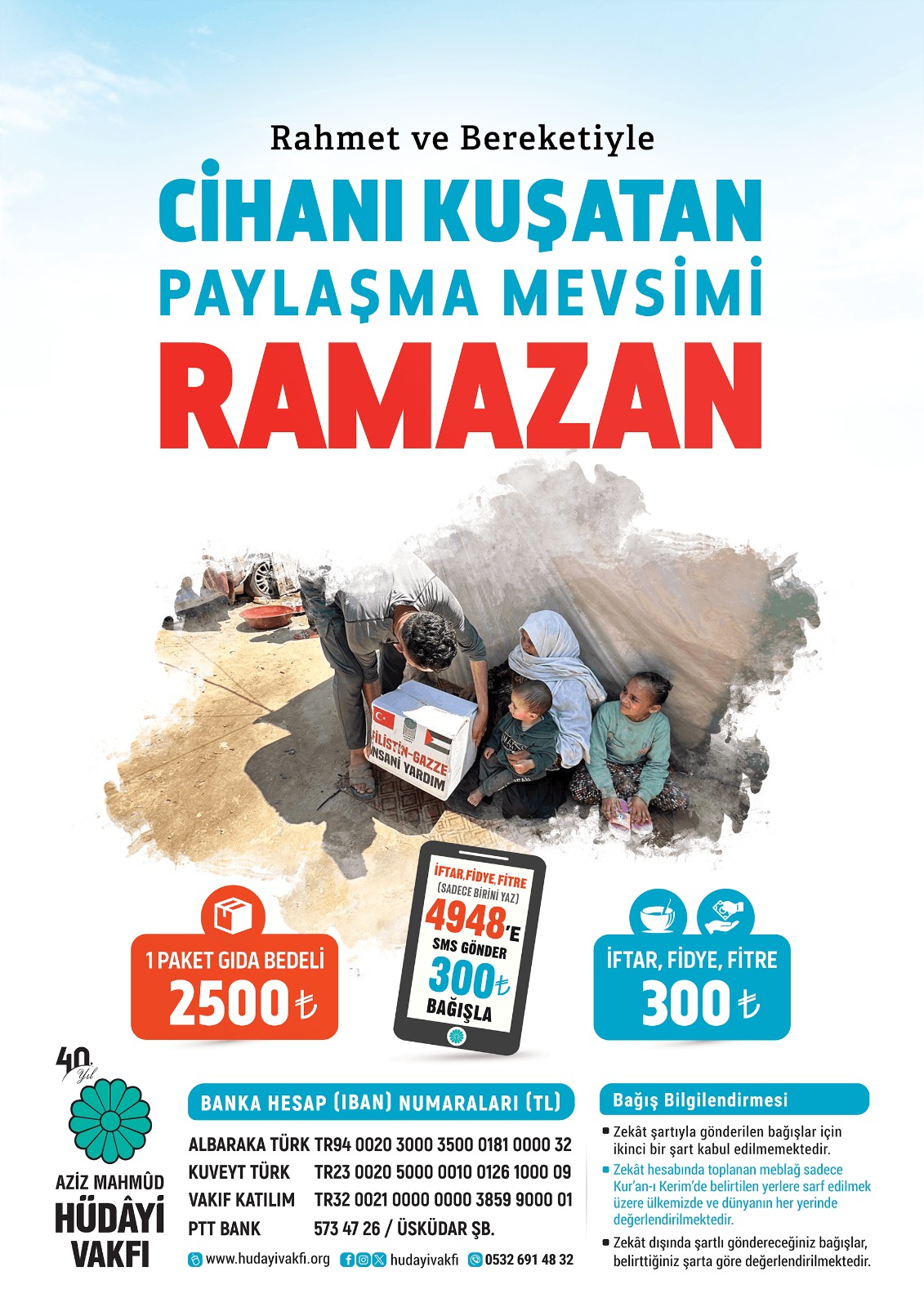 İFTAR, FİDYE veya FİTRE sadece birini yazıp 4948'e SMS göndererek 300 ₺ bağışta bulunabilirsiniz.