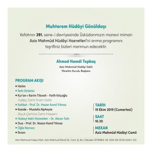 Buradasınız:Anasayfa»AZİZ MAHMÛD HÜDÂYİ HAZRETLERİ»AZİZ MAHMÛD HÜDÂYİ HAZRETLERİ’Nİ ANMA PROGRAMINA DAVETLİSİNİZ»hudayı haftası_davetiye_ic-min