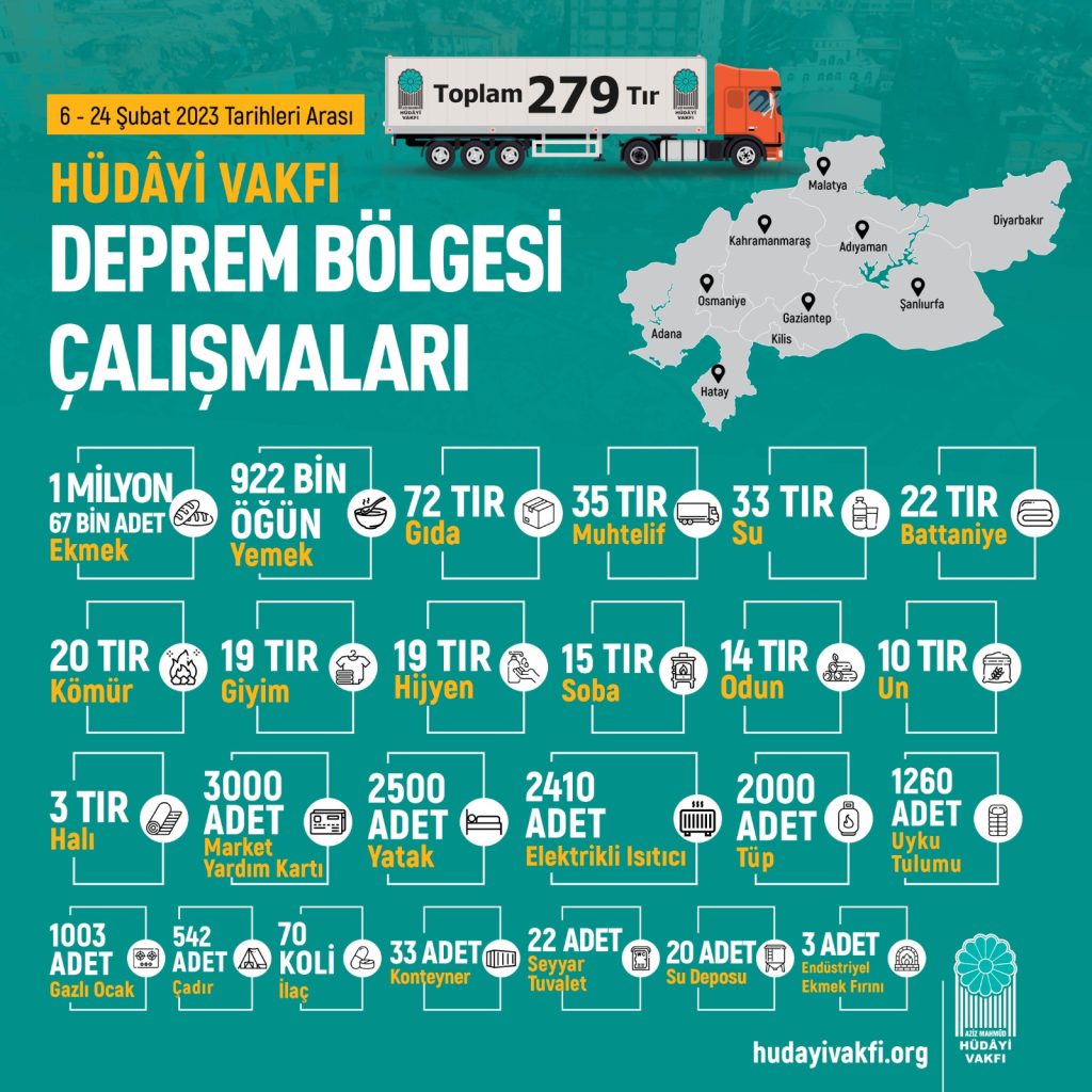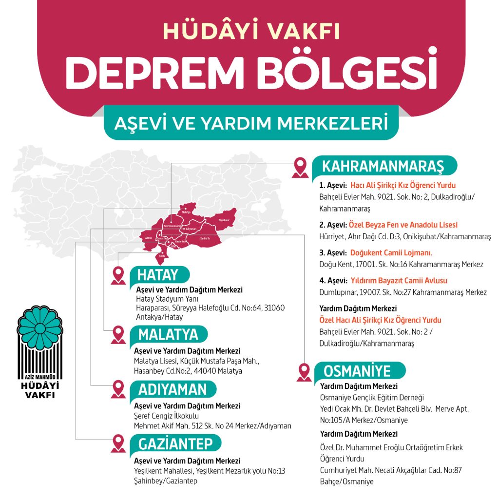 Hüdayi Vakfı olarak ilk günden beri sahadaydık, yine sahadayız. Sizler de havale, EFT, online bağış ve SMS hizmetlerimiz üzerinden yardımlarınızı ulaştırabilirsiniz.