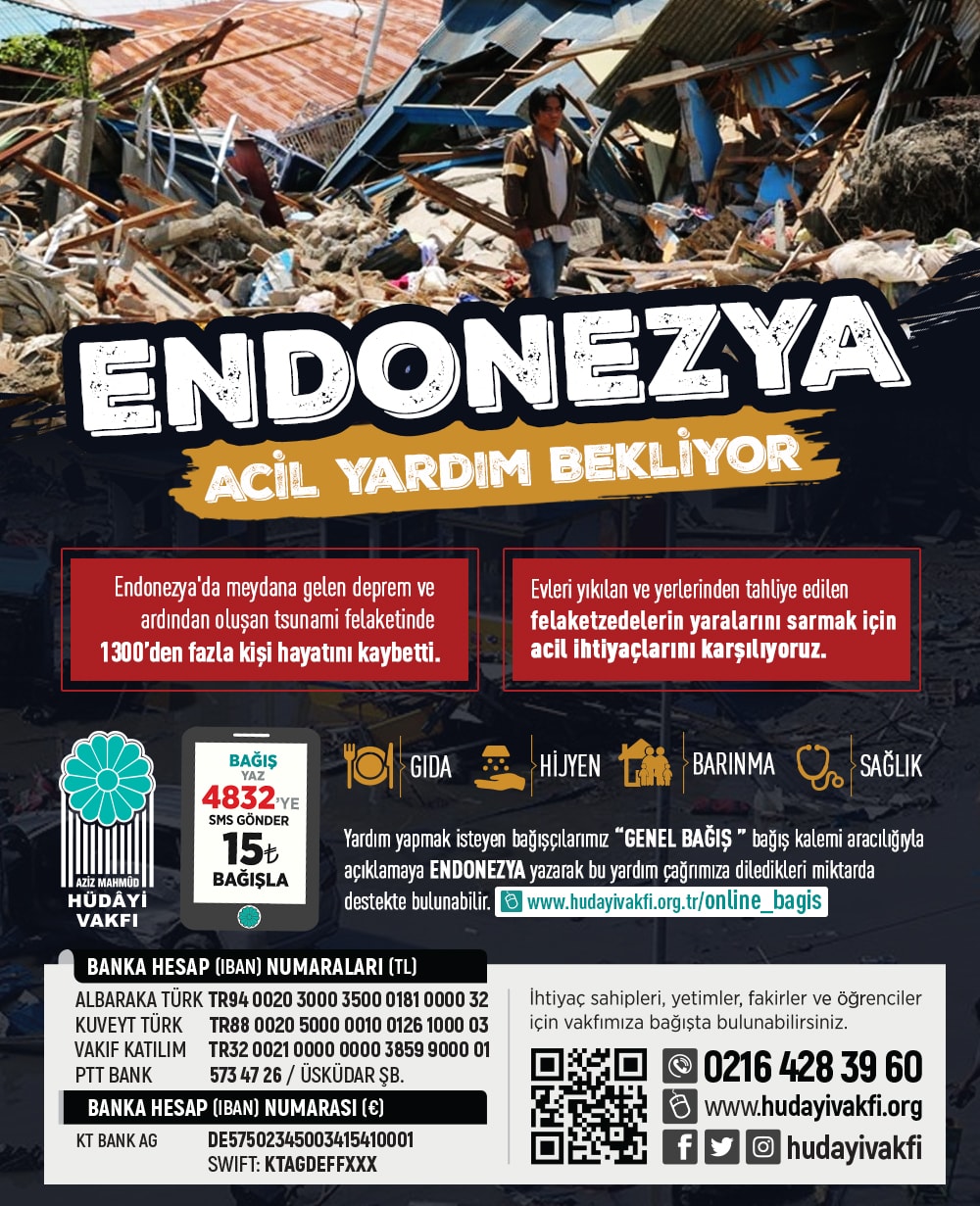 “Hüdâyî Acil Yardım (HAY)” kapsamında yurt içinde ve yurt dışında meydana gelen deprem, sel, kuraklık, salgın hastalık gibi doğal felâketlerden etkilenenlere yönelik acil yardımlarda bulunan vakfımız Endonezya için de yardım çalışması başlattı.