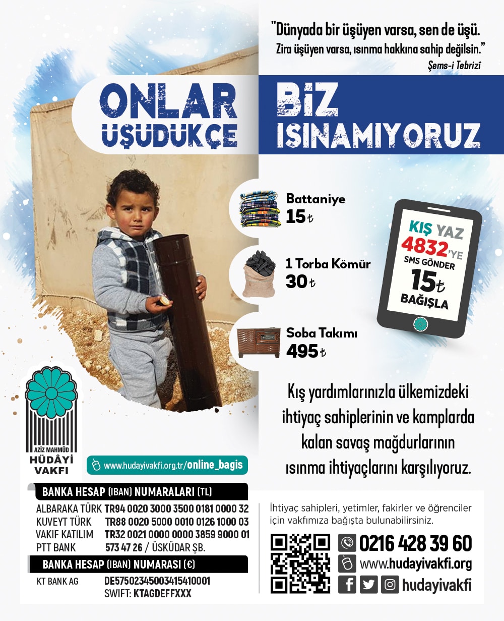 Kış boyunca mazlum ve muhtaçlara yapılan kış yardımlarına destek için 4832’ye KIŞ yazıp kısa mesaj göndererek siz de15 TL bağışta bulunabilirsiniz.