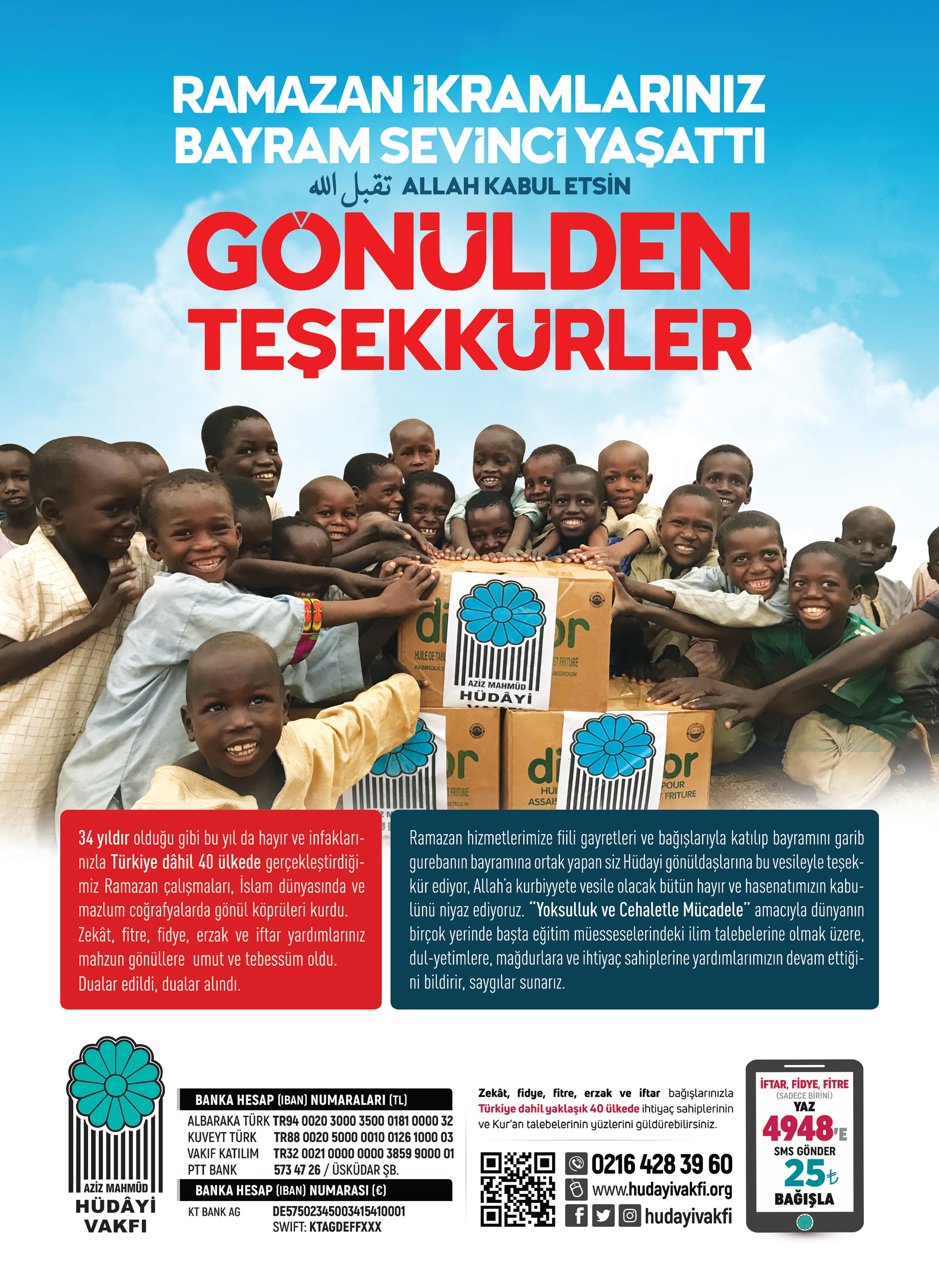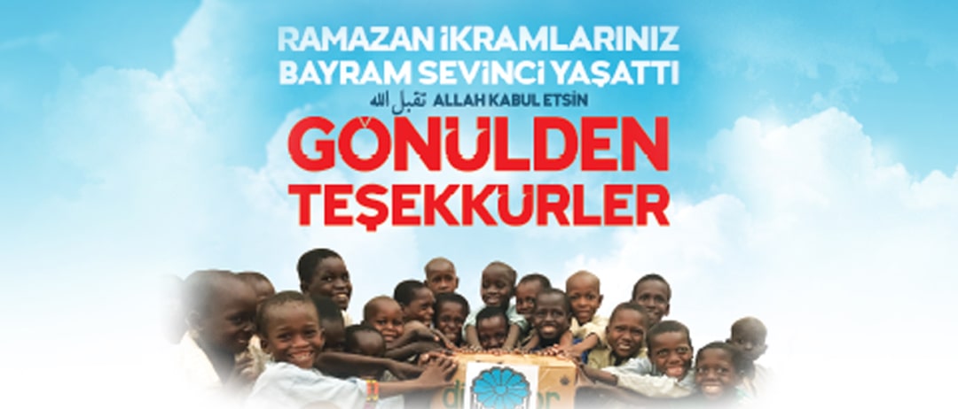 “Rahmet ve Bereketiyle Cihanı Kuşatan, Paylaşma Mevsimi Ramazan” çağrısıyla başlattığımız yardım çalışmalarımıza fiili gayretleri ve bağışlarıyla katılıp bayramını garib gurebanın bayramına ortak yapan siz Hüdayi gönüldaşlarına bu vesileyle teşekkür ediyor, Allah’a kurbiyyete vesile olacak bütün hayır ve hasenatımızın kabulünü niyaz ediyoruz.