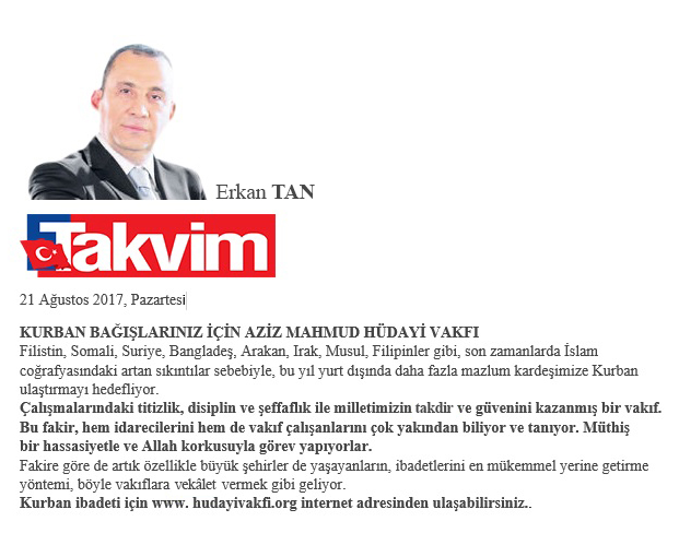 KURBAN BAĞIŞLARINIZ İÇİN AZİZ MAHMUD HÜDAYİ VAKFI - (TAKVİM.COM.TR) 21.08.2017