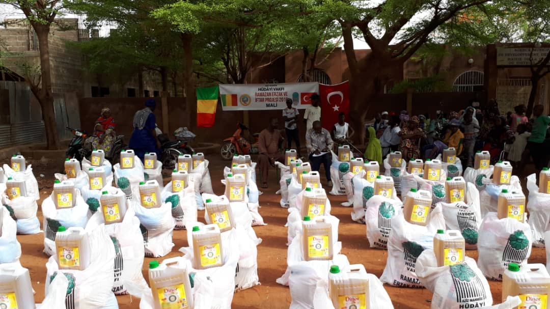 Hüdâyi Vakfı’nın gönderdiği yardımlarla yaptığımız eğitim, gıda, adak kurban, su kuyusu projeleri yanında Ramazan aylarında da Mali’de başta başkent Bamako ve Segou, Sikasso şehirlerinde gıda kolileri dağıtıyoruz. Medine İmam Hatip Lise’sindeki aşevimizde pişen yemeklerle günlük 6 ayrı bölgede iftar sofraları kuruyoruz. Ayda bir belki de yılda bir et yiyen arka mahallerdeki muhtaçlar, dul ve yetim aileler için sadaka kurbanları kesip dağıtımını gerçekleştiriyoruz.