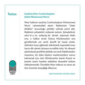 Buradasınız:Anasayfa»BASIN AÇIKLAMALARI»SEÇİLMİŞ MISIR CUMHURBAŞKANI ŞEHİD MUHAMMED MURSİ İÇİN TAZİYE MESAJI»tazye