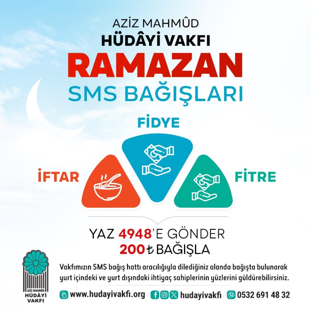 Ramazan ayı boyunca IFTAR, FITRE, FIDYE (Sadece birini) yazıp 4948' e SMS göndererek 200₺ bağışlayabilirsiniz.