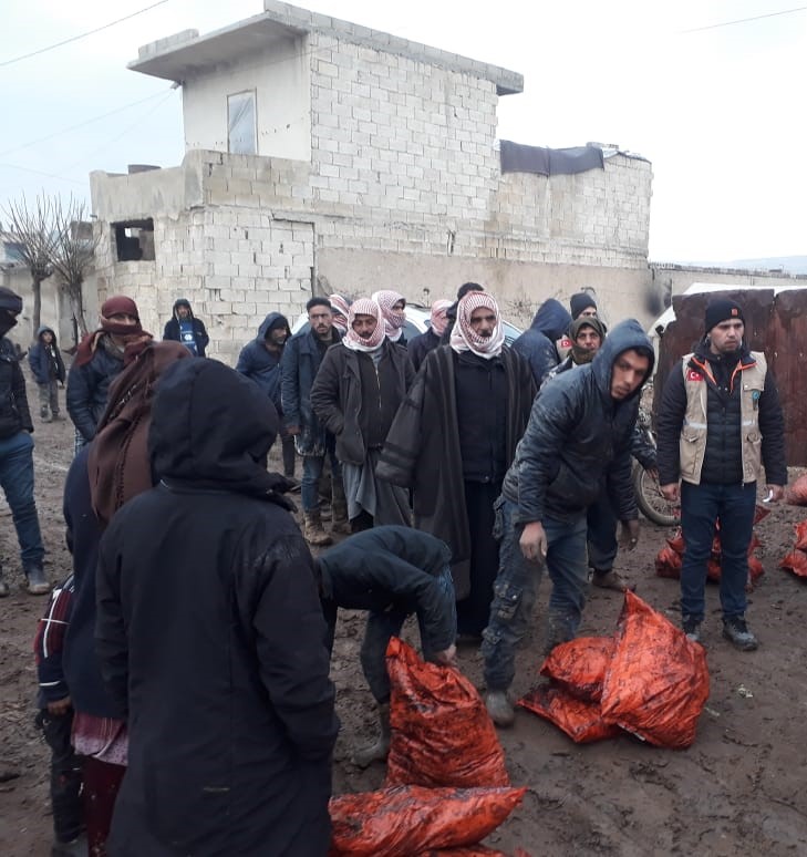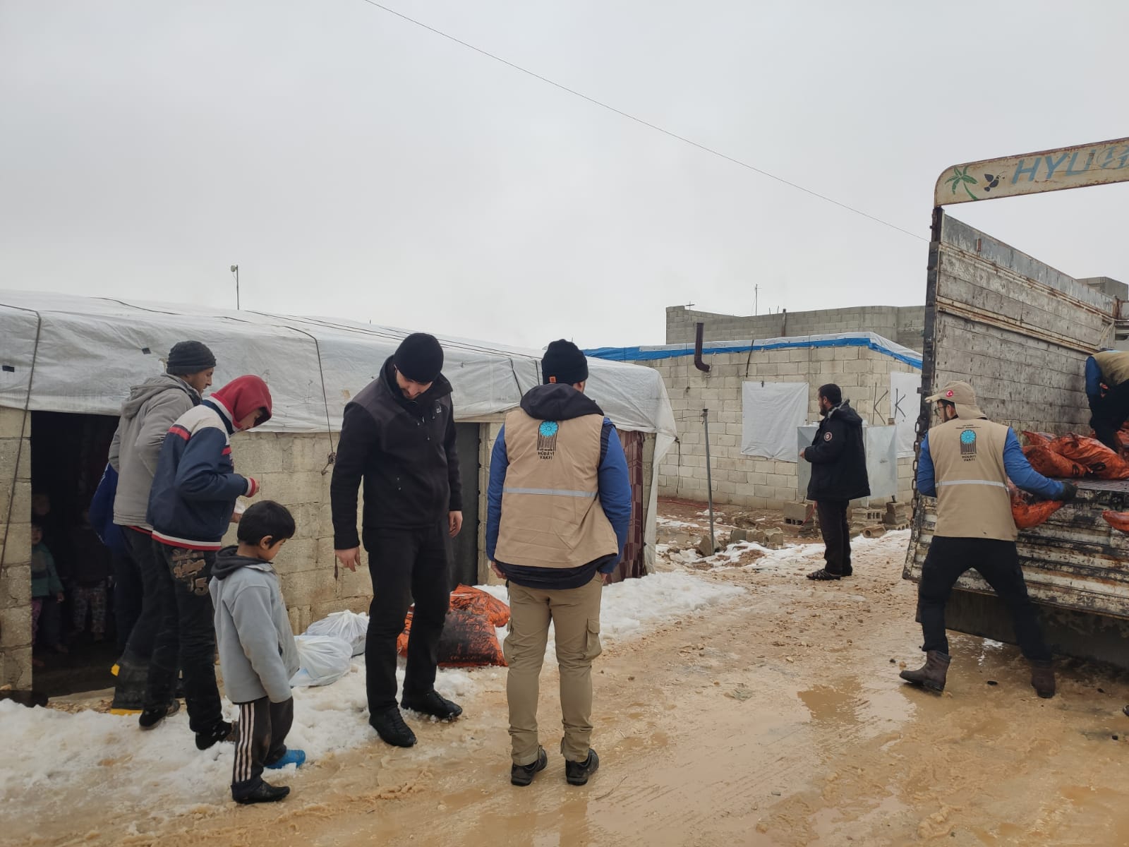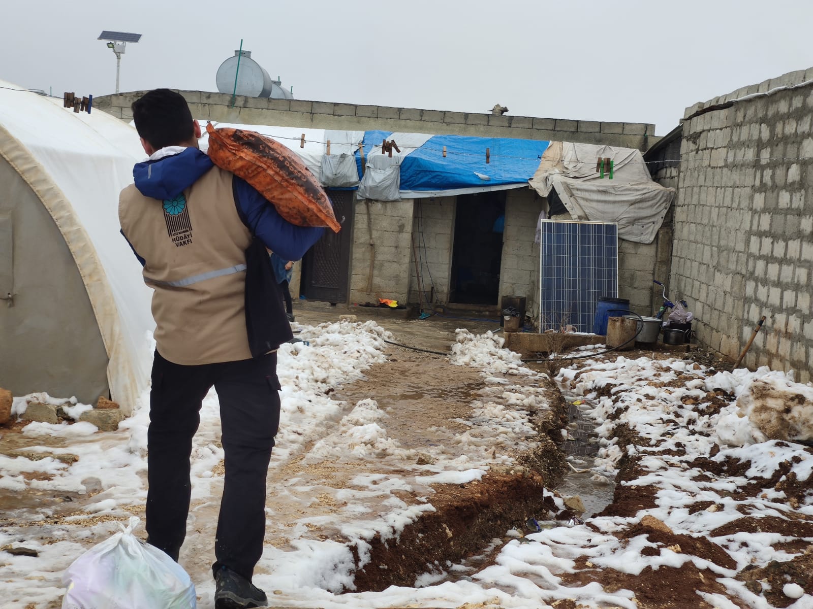 Suriye’nin İdlib, Azez, Afrin bölgelerinde yoğun kar yağışı altında çadır kamplarda hayat mücadelesi veren savaş mağdurlarına; soba, kömür, battaniye, branda, halı, hasır, sünger yatak, kışlık kıyafet, bot, gıda-hijyen paketleri, mutfak eşyaları ve nakdi yardımları sahadaki ekiplerimizle dağıtmaya devam ediyoruz.