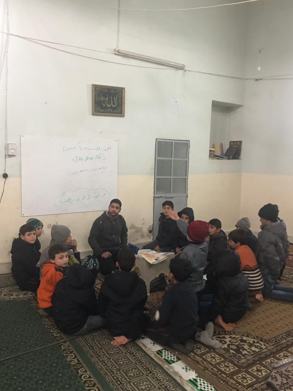 Ziyaret ettiğimiz yerlerden biri olan Afrin’in Maabatlı köyü camiinde Kur’an-ı Kerim ve temel dini bilgiler eğitimi verilmektedir. 70-80 metrekarelik bir camide şartların elvermemesi nedeniyle 60’dan fazla öğrenci 10 kişilik gruplara ayrılmış. Üniversite okuyan gençler tarafından fedakâr bir şekilde Kur'an eğitimi veriliyor. Gençlerin hepsi Şam yakınında uzun süre kuşatma altına alınan ve sonra da göçe zorlanan Doğu Guta bölgesinden gelmiş. Yüzlerindeki masumluk ve mahzunlukla beraber aşk ve heyecanla ders anlattıklarını, tahtaya yazdıkları yazıları silgileri olmadığı için elleriyle sildiklerini görmek hepimizi derinden etkiledi. Tüm zorluklara rağmen bu coğrafyadaki fedakâr hocaların eğitim aşkı geleceğe dair umutlarımızı diri tutuyor, ortaya koydukları bu gayretleri gelecek nesil adına bizleri daha da umutlandırıyor.