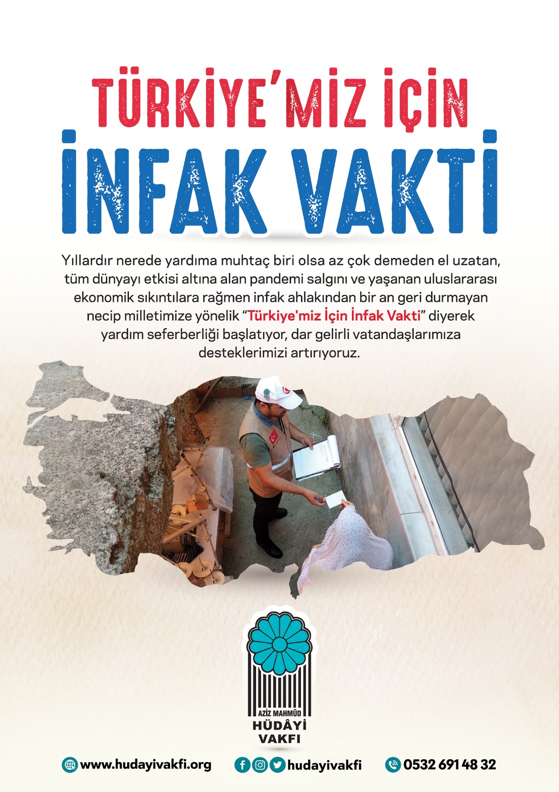 Yıllardır nerede yardıma muhtaç biri olsa az çok demeden el uzatan, tüm dünyayı etkisi altına alan pandemi salgını ve yaşanan uluslararası ekonomik sıkıntılara rağmen infak ahlakından bir an geri durmayan necip milletimize yönelik; “Türkiye’miz İçin İnfak Vakti” diyerek yardım seferberliği başlatıyor, dar gelirli vatandaşlarımıza desteklerimizi artırıyoruz.